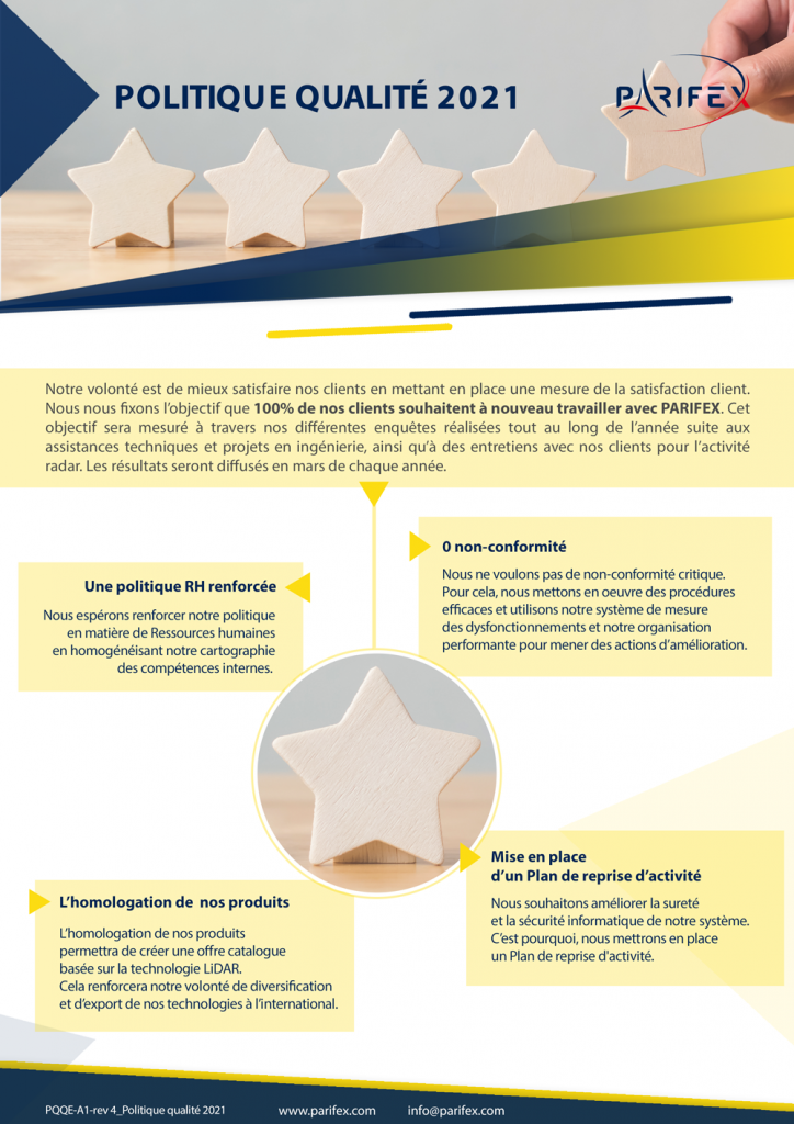 La qualité est au cœur de nos priorités. Notre volonté est de toujours mieux satisfaire nos clients, et, pour cela, nous mettons en place une mesure de la satisfaction client. Nous nous fixons l’objectif que 100% de nos clients souhaitent à nouveau travailler avec PARIFEX. Cet objectif sera mesuré à travers nos différentes enquêtes réalisées tout au long de l’année suite aux assistances techniques et projets en ingénierie, ainsi qu’à des entretiens avec nos clients pour l’activité radar.